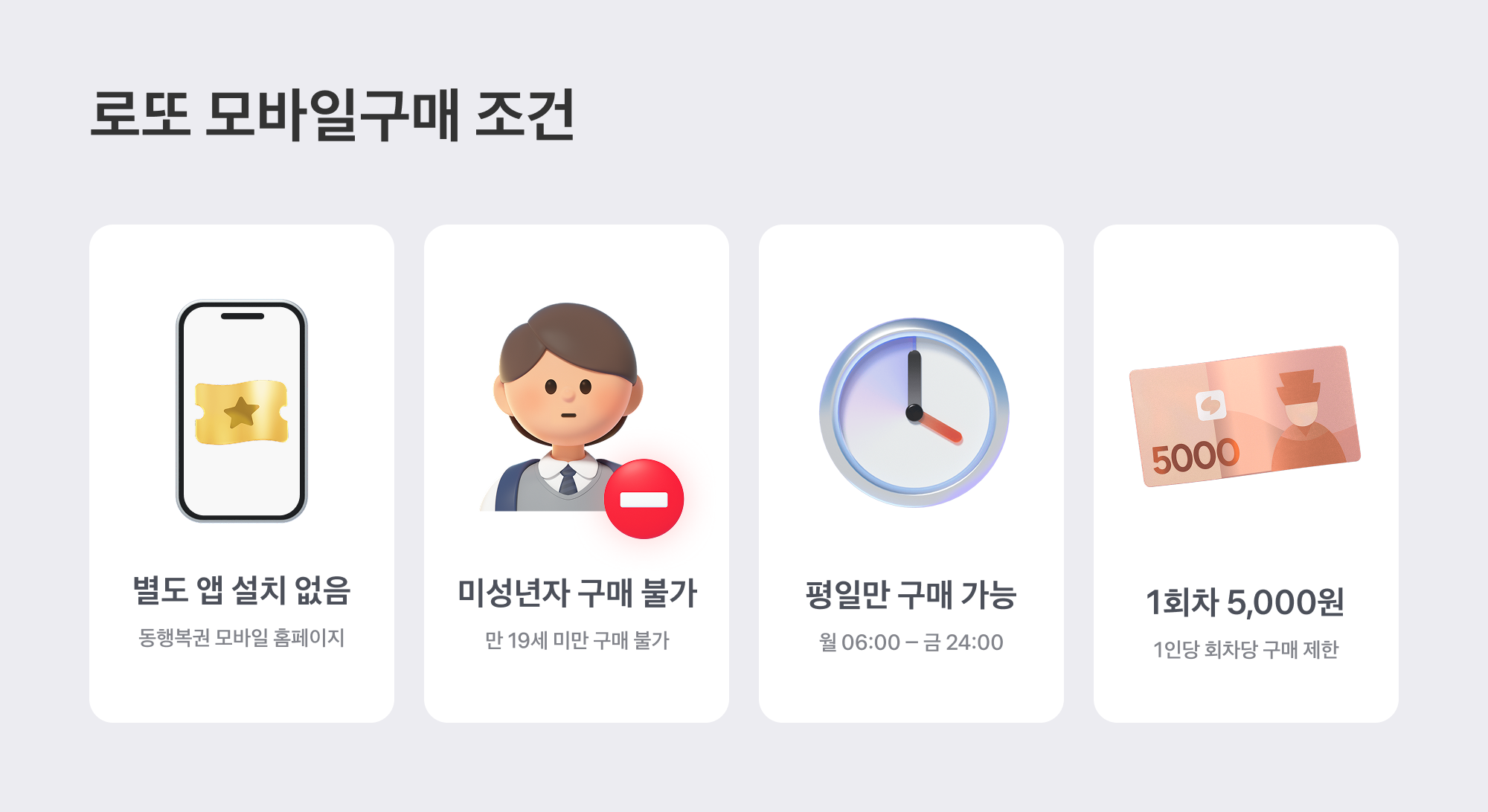 로또 모바일 구매는 반드시 본인 명의로만 가능하며, 타인 명의 도용이나 대리 구매는 법적으로 금지되어 있습니다. 미성년자는 복권 구매가 불가능하므로 성인 인증이 필수입니다.